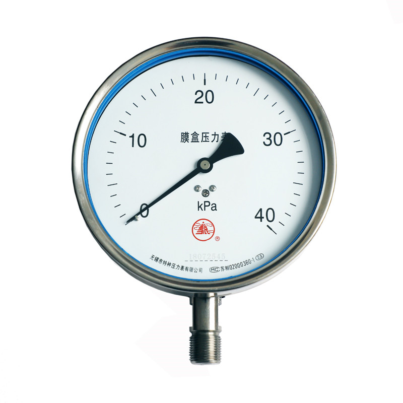 不銹鋼膜盒壓力表采用不銹鋼波紋膜盒作為測量微小壓力的敏感元件。不銹鋼膜盒壓力表適用于測量對不銹鋼不起腐蝕作用,無爆炸危險的氣體或液體的微小壓力。表盤上面有調零裝置,可以方便調整零位。不銹鋼膜盒壓力表廣泛應用于石油、化工、冶金等工業部門壓力測量,不銹鋼膜盒壓力表可以就地安裝并現場指示壓力。