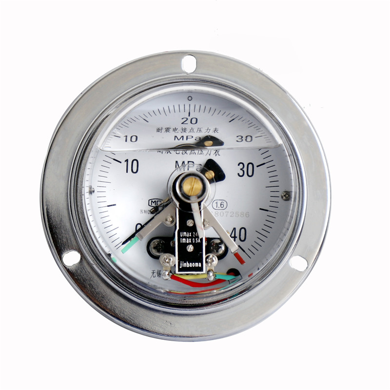 不銹鋼耐震電接點壓力表具有抗介質脈動和沖擊載荷,耐環境振動等優異特性,適用測量對不銹鋼316L無腐蝕性的氣體,液體或蒸汽等壓力或真空度。根據測量范圍分為不銹鋼耐震電接點壓力表和不銹鋼耐震電接點真空表(用于真空系統);安裝結構形式有徑向無邊直接式、軸向無邊直接式、軸向帶前邊式和徑向帶邊(前邊或者后邊)式,滿足不同安裝需求。儀表設上、下限二位開關型接點裝置(可選雙上限或雙下限接點裝置),在壓力達到設定值時發出信號或通斷控制電路,供作業系統自動控制或發訊用。其抗振結構可有效抑制指針的抖動、沖擊,保護接點,使儀表指示清晰,電信號切換可靠,工作穩定。廣泛應用于機械、化工、石油、冶金、電力等工業生產過程壓力控制。