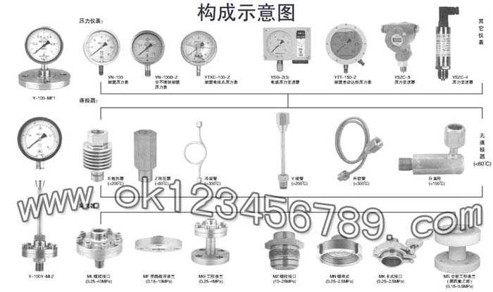 隔膜壓力表為組合型產品,有三部分組成(詳見構成示意圖):