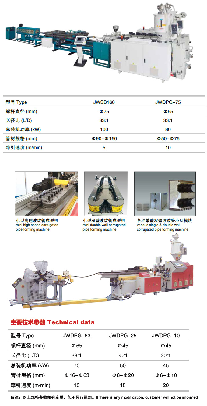 單壁、雙壁波紋管生產(chǎn)線 性能和優(yōu)點(diǎn): 該設(shè)備生產(chǎn)出的管材,耐高溫,耐腐蝕,耐磨損,強(qiáng)度高。用于電氣穿線管、汽車 穿線管、護(hù)套管、機(jī)床產(chǎn)品、包裝食品機(jī)械、電力機(jī)車、工程安裝、燈具、自動(dòng)化儀器儀表等領(lǐng) 域,市場(chǎng)需求大。金緯公司特殊螺桿、模具的結(jié)構(gòu)設(shè)計(jì)合理,更換模具方便可靠,解決了螺桿機(jī) 筒易磨損及物料成形難的問(wèn)題,生產(chǎn)線速度快,運(yùn)行穩(wěn)定,控制簡(jiǎn)捷易操作。